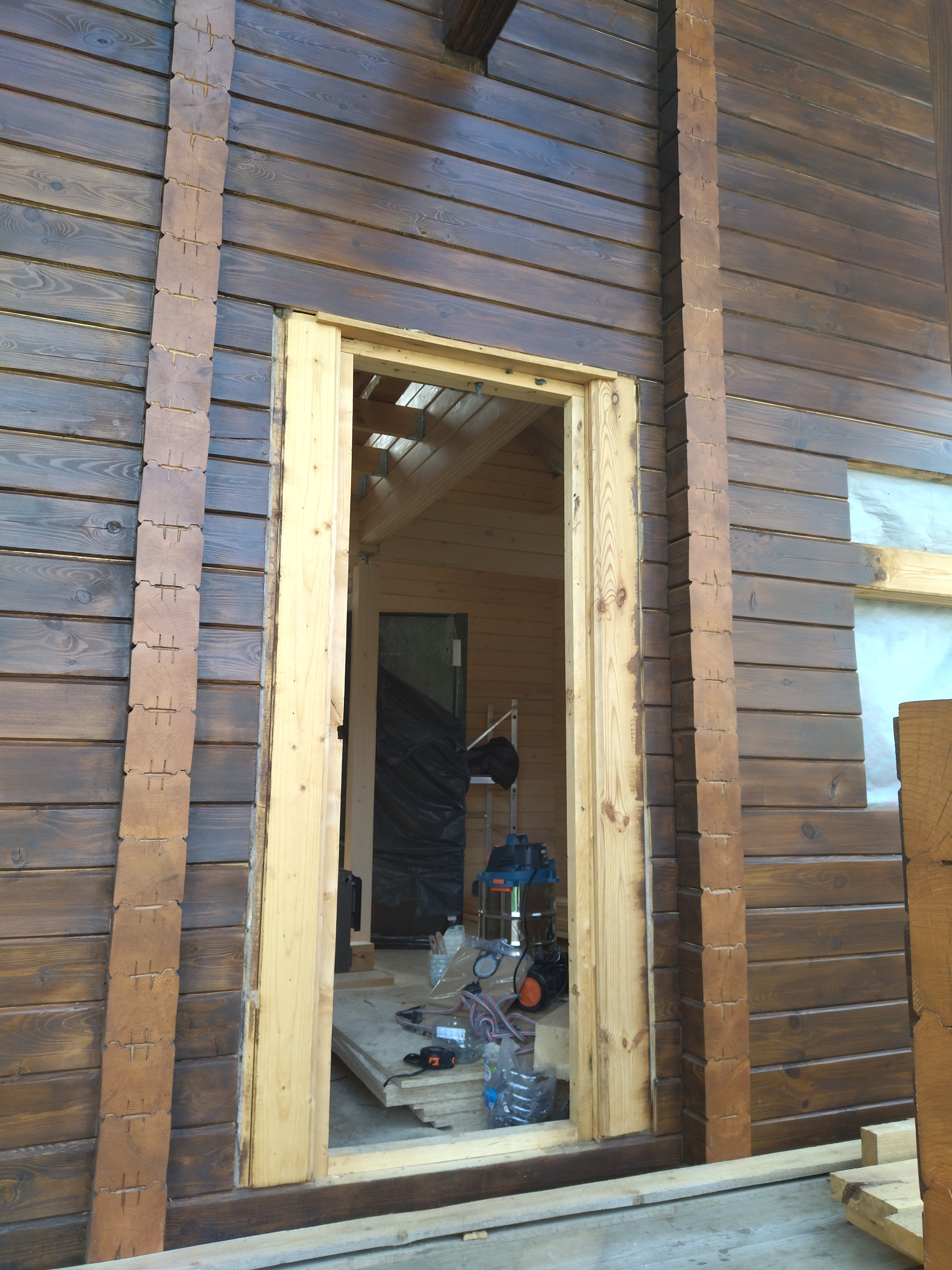 Интересует установка двери в частном доме (д. Афинеево). Дом из профилированного бруса, ширина проёма 103 см, высота 203 см. Обсаду для временной двери, думаю, разберу сам. Нужно установить дверь с учётом того, что дом будет садиться. Дверь покупал в Леруа следующую .